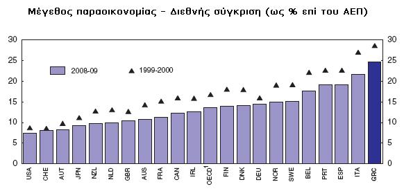 «Αν και τα εν λόγω στοιχεία πρέπει να εξετάζονται με προσοχή», σημειώνει ο ΟΟΣΑ, «η Ελλάδα συνήθως κατατάσσεται υψηλά σε σχετικές διεθνείς έρευνες». Τα πιο πρόσφατα στοιχεία υπολογίζουν το μέγεθος της παραοικονομίας στην Ελλάδα στο 25% του ΑΕΠ, χαμηλότερα μεν από το 29% στις αρχές της δεκαετίας αλλά στο υψηλότερο επίπεδο μεταξύ του συνόλου τω 21 χωρών-μελών του ΟΟΣΑ που εξετάζονται.